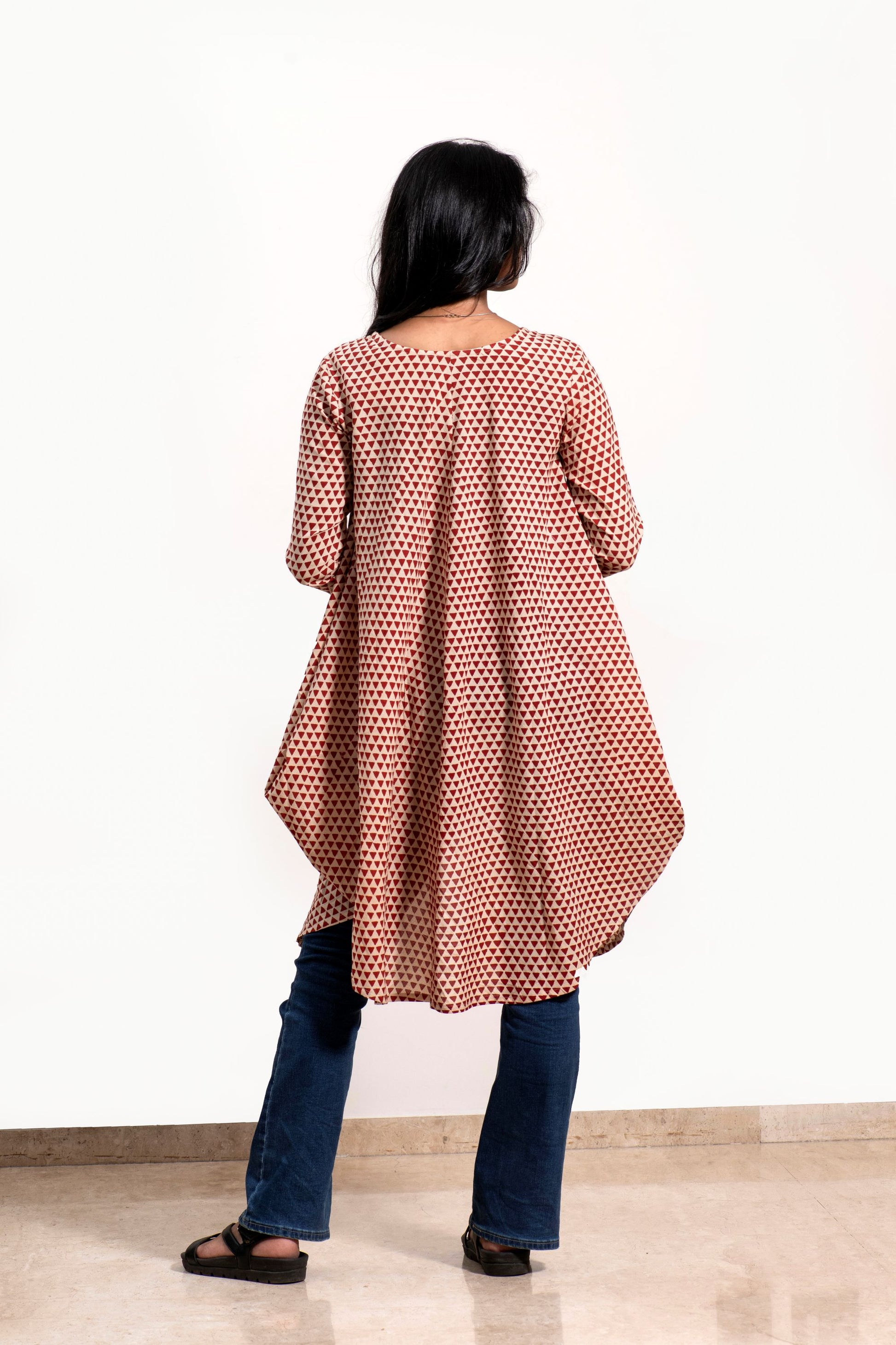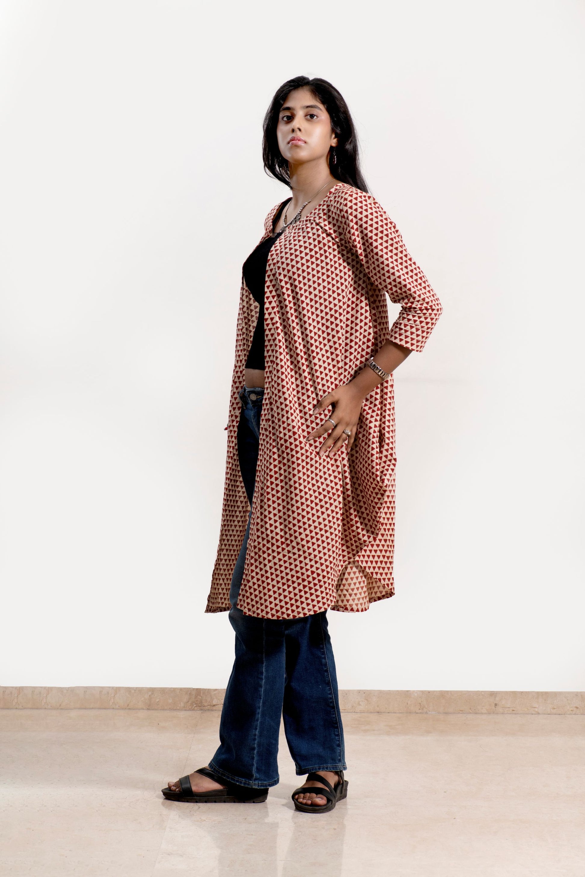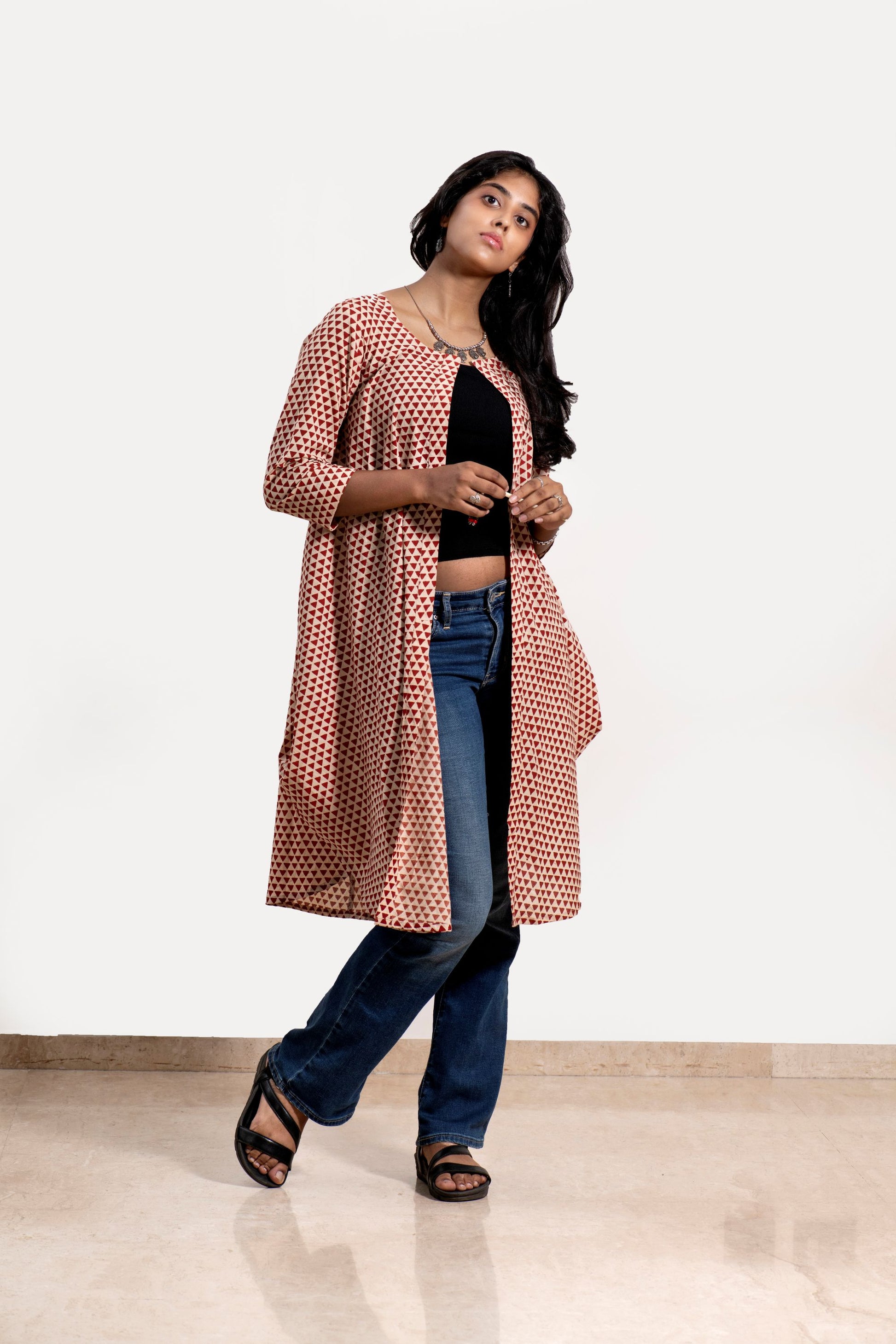 This stylish hand block printed shrug features a unique silhouette with cowl cuts on the sides and a front-open design. Effortlessly versatile, it can be layered over a spaghetti top with denims or a short dress, adding a modern, flowy edge to your look.