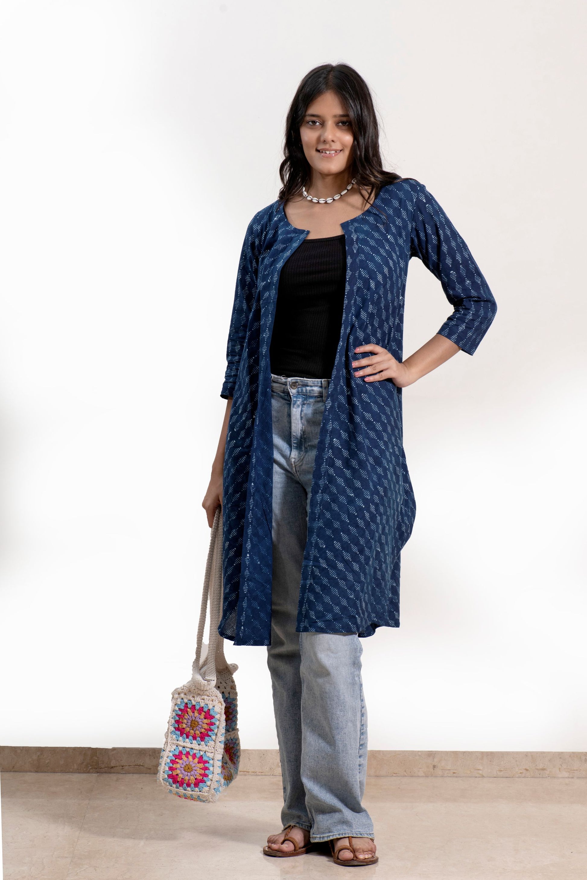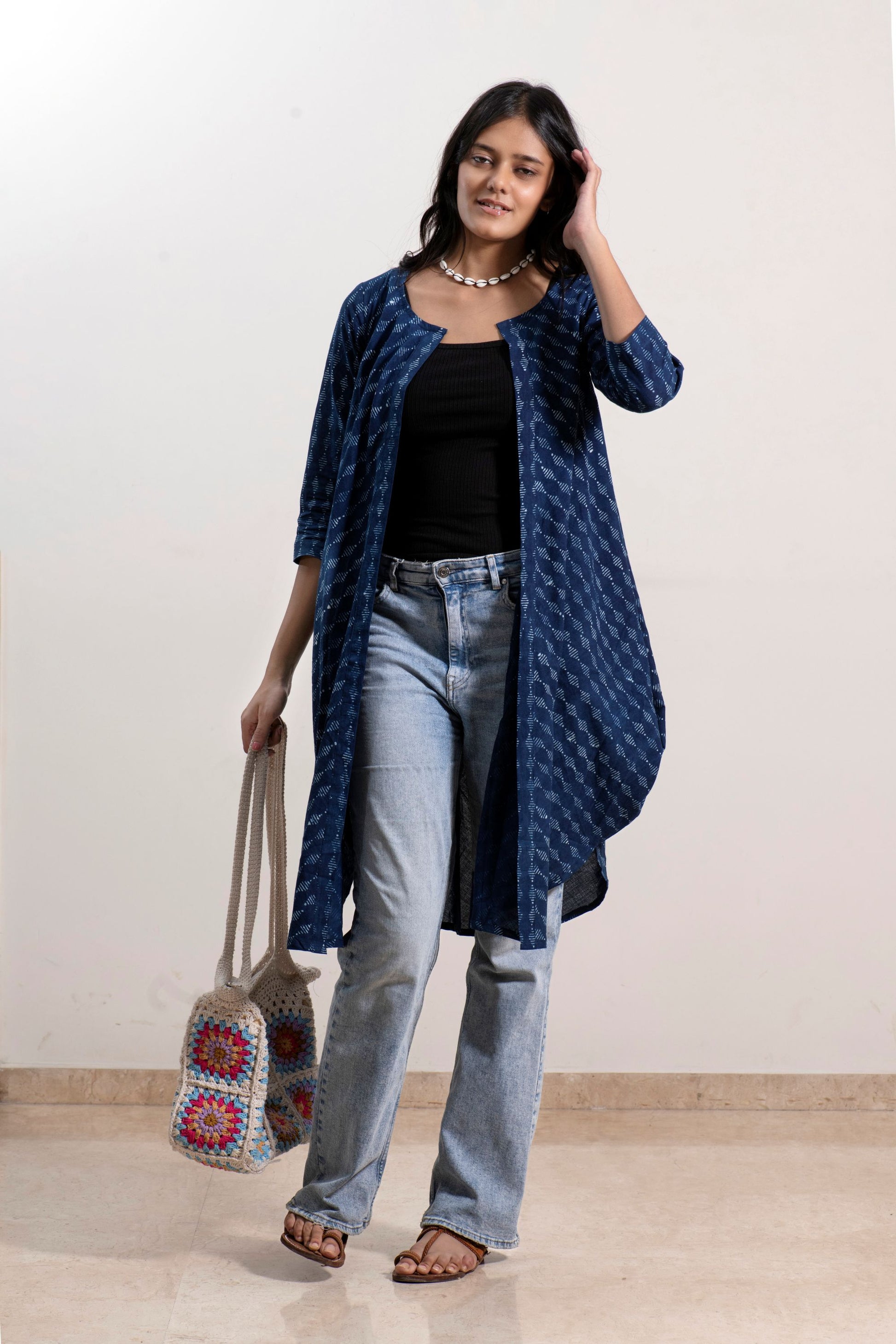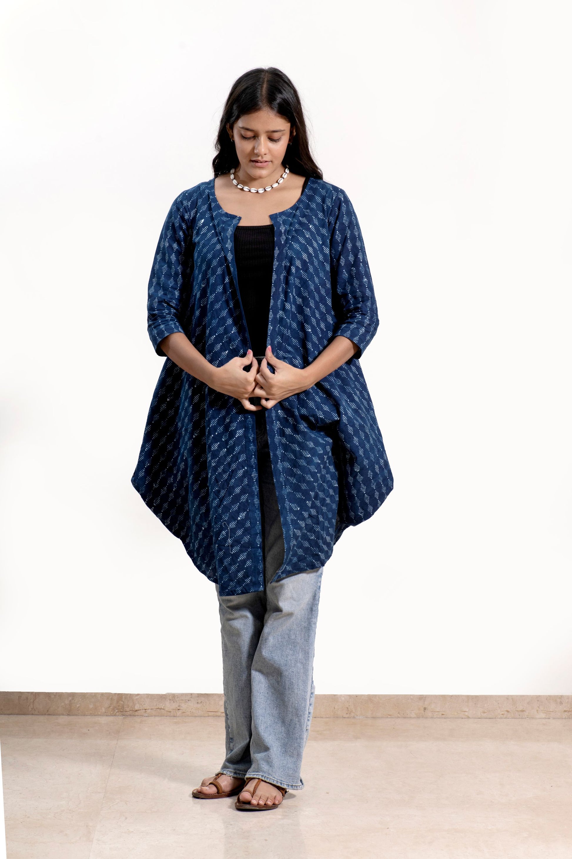 This stylish hand block printed shrug features a unique silhouette with cowl cuts on the sides and a front-open design. Effortlessly versatile, it can be layered over a spaghetti top with denims or a short dress, adding a modern, flowy edge to your look.